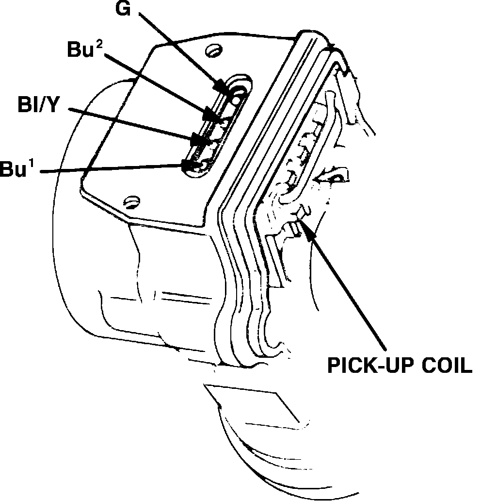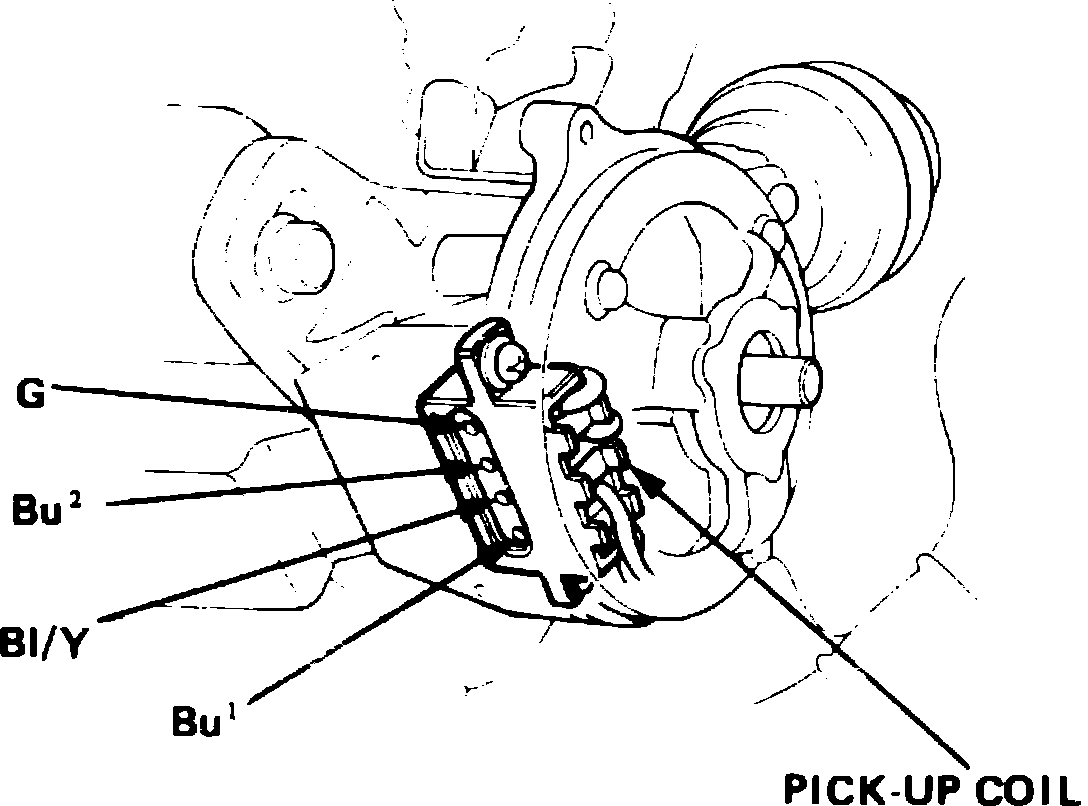 4. Using suitable ohmmeter, check resistance between terminals G and Bu (2) of pickup coil. Resistance should be 650-850 ohms at room temperature. If resistance is not as specified, replace pickup coil.