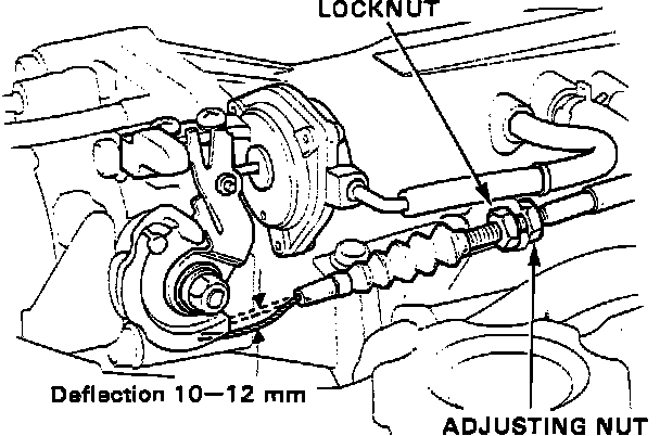 5. If throttle cable deflection is not within specifications, loosen the lock nut and turn the adjusting nut until the deflection is as specified.