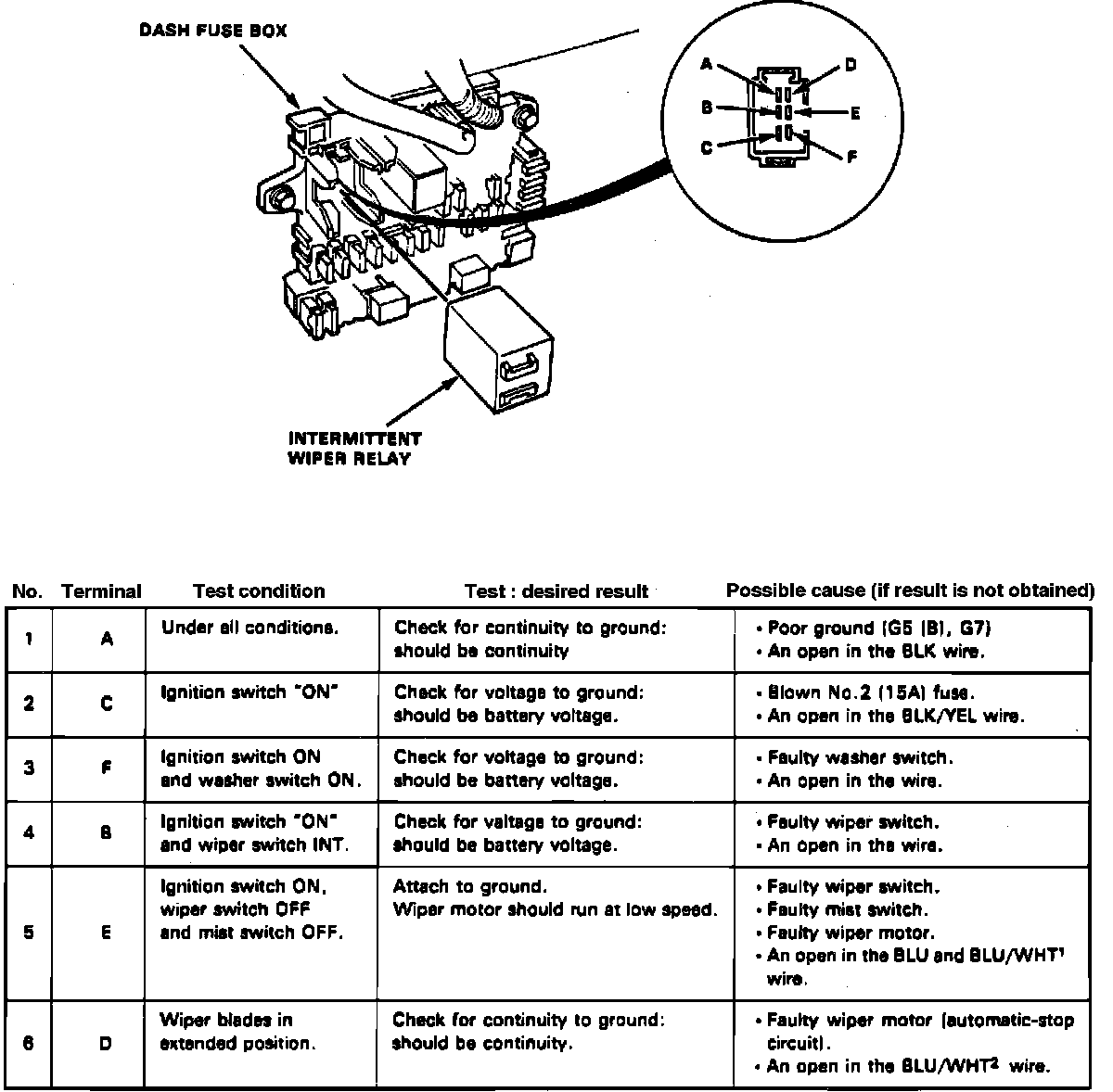 7. With wiper blades in extended position, check terminal D to ground for continuity, continuity should be indicated, if not, faulty wiper motor or an open in blue/white wire is indicated.