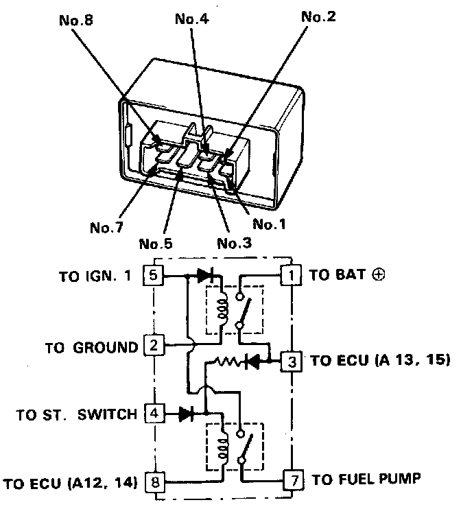 2. Attach the battery positive terminal to the No.4 terminal and the battery negative terminal to the No. 8 terminal of the main relay. Then check for continuity between the No.5 terminal and No.7 terminal of the main relay.