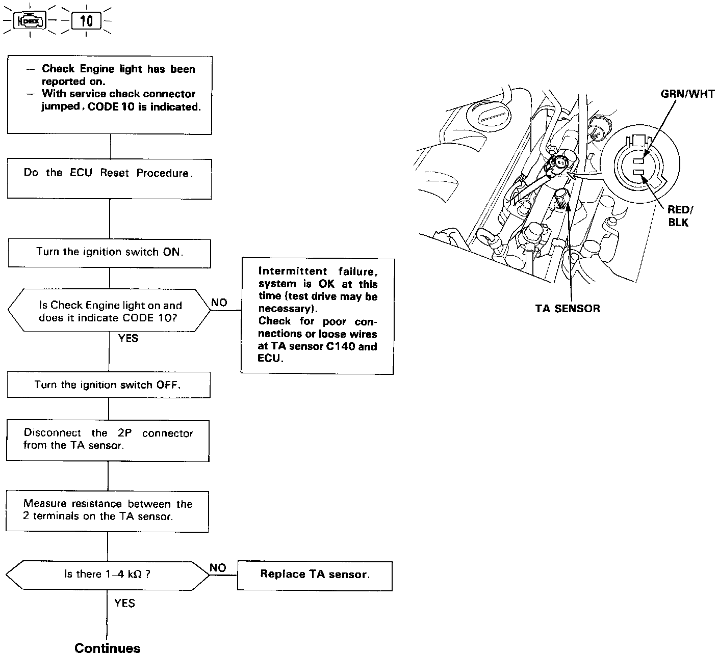 Self-diagnosis Check Engine light indicates code 10: A problem in the Intake Air Temperature (TA) Sensor circuit.