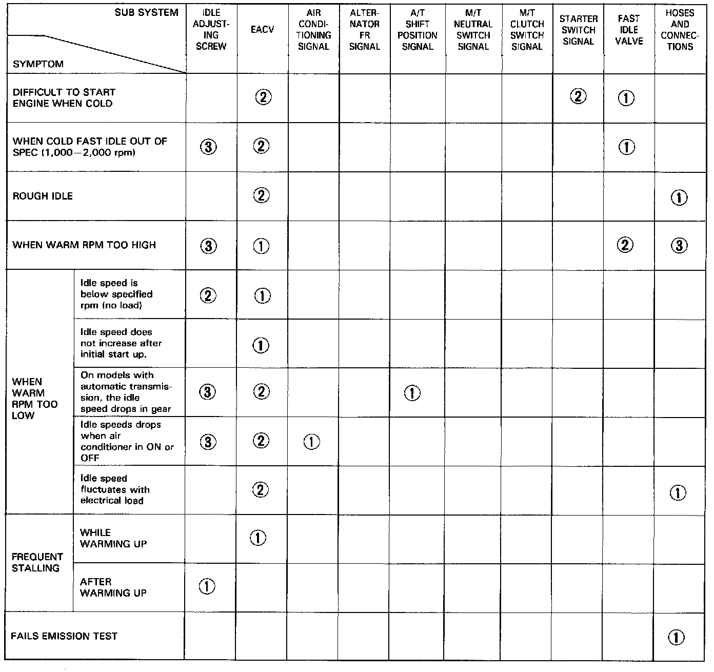 - If the above items are normal, substitute a known-good EACV and readjust the idle speed.