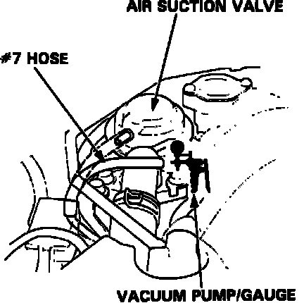 6. If bubbling sound is not heard, disconnect #7 vacuum hose from the top of the air suction valve, attach a vacuum gauge, and check for vacuum within 10 seconds after restart.