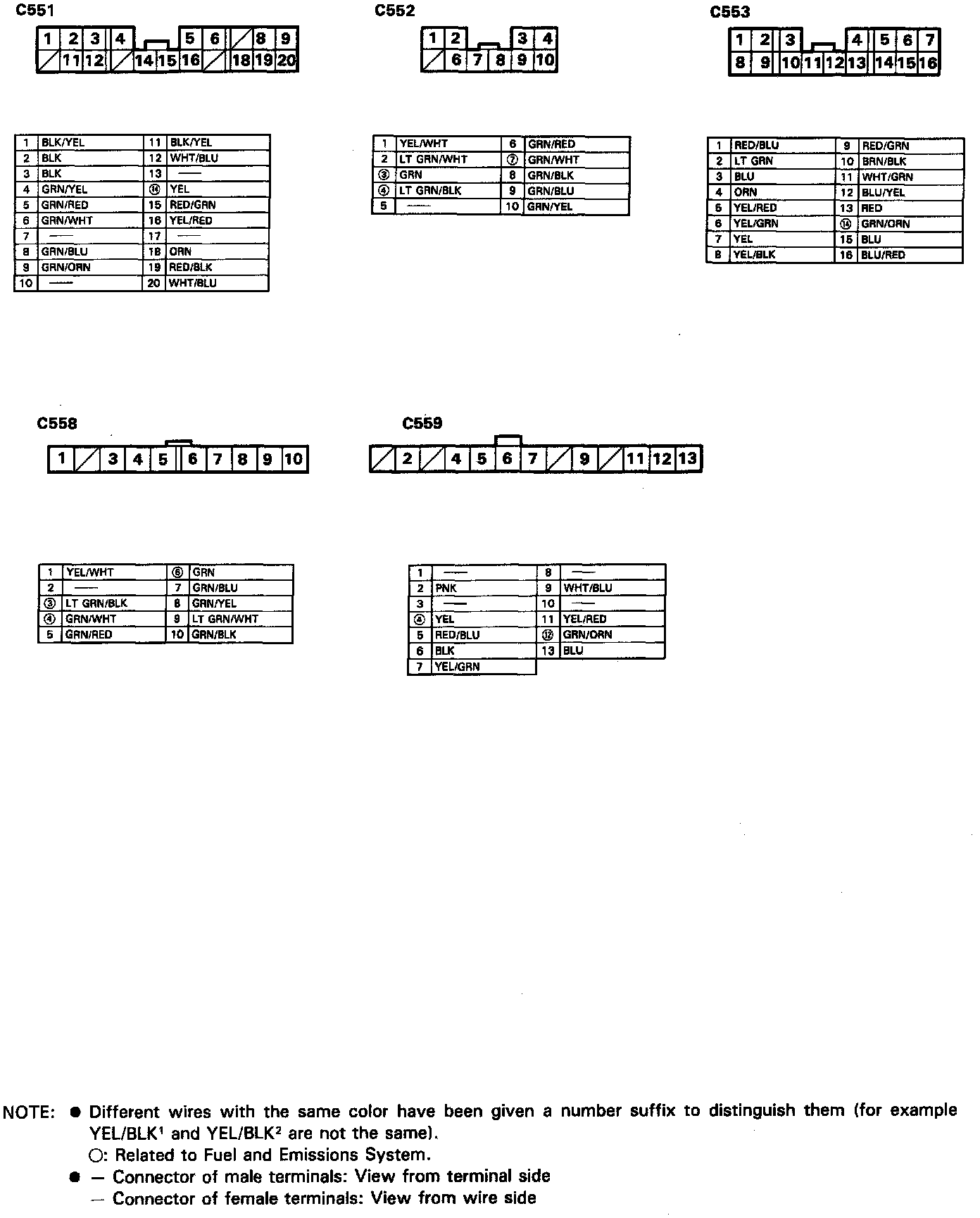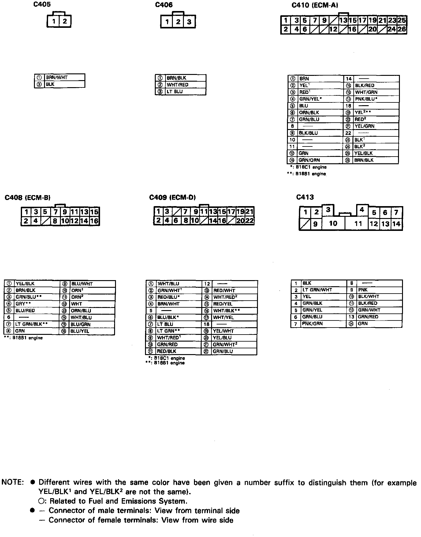 - Different wires with the same color have been given a number suffix to distinguish them (for example, YEL/BLK1 and YEL/BLK2 are not the same).