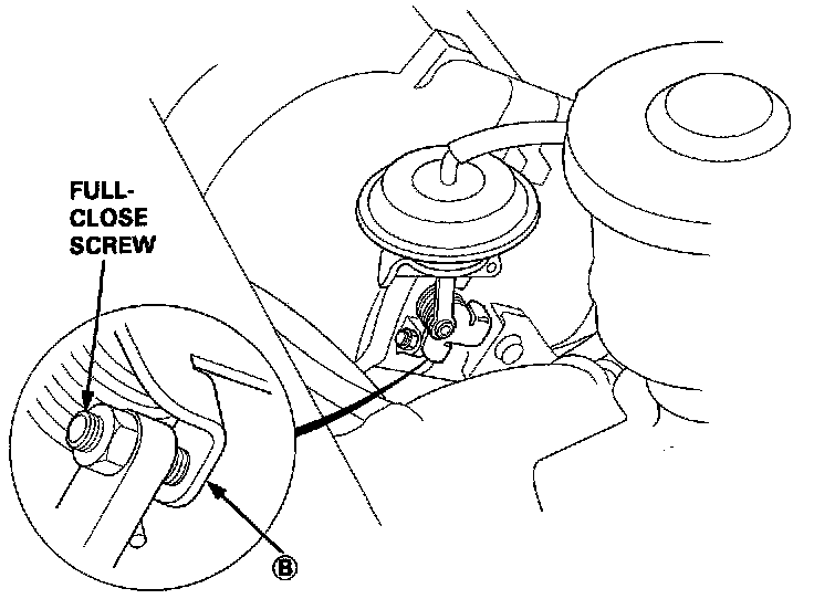 4. With the engine at idle, check that B of the IAB control valve is in close contact with the full-close screw when the vacuum hose is connected.