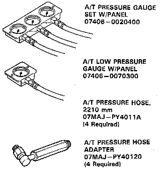 NOTE: Use the A/T Pressure Gauge Set (07406- 0020003) or A/T Low Pressure Gauge (07406- 0070000), and the A/T pressure gauge hoses and adapters shown above.