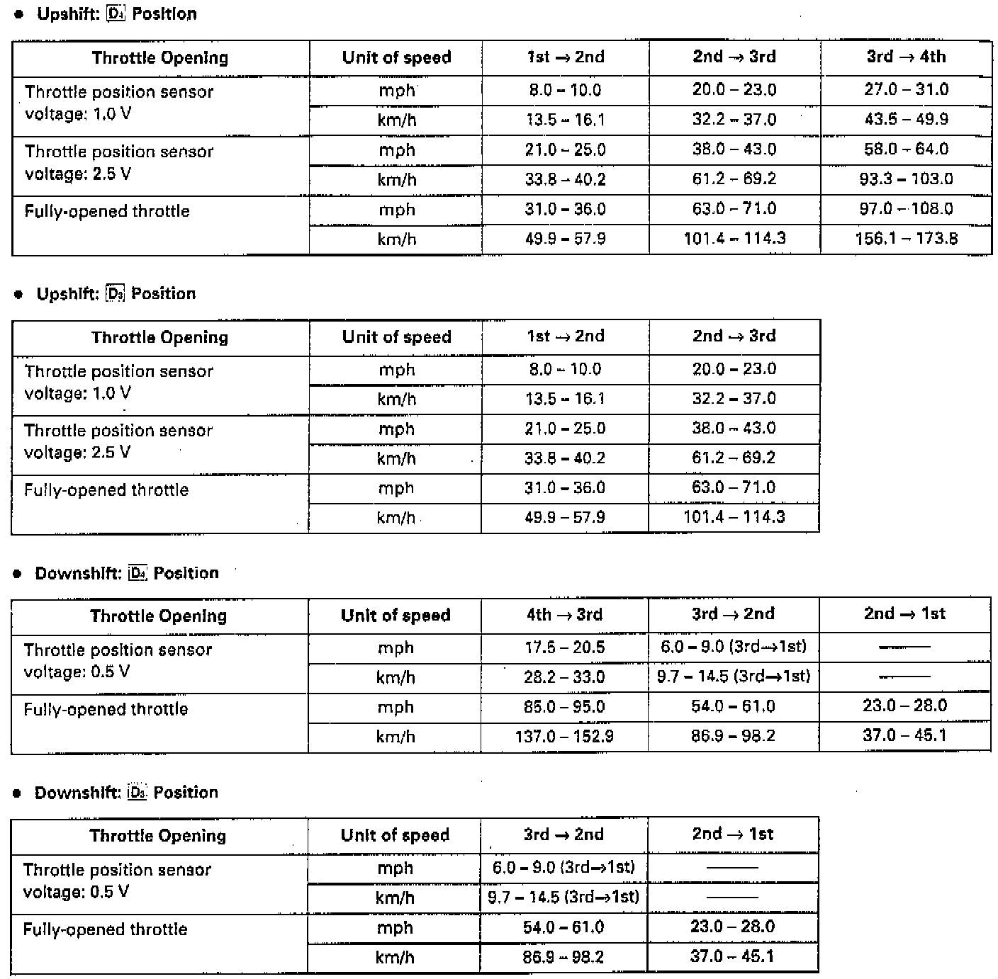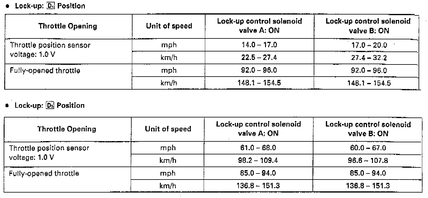 3. Test drive the car on a flat road in the D4 position. Check that the shift points occur at approximate speeds shown. Also check for abnormal noise and clutch slippage.