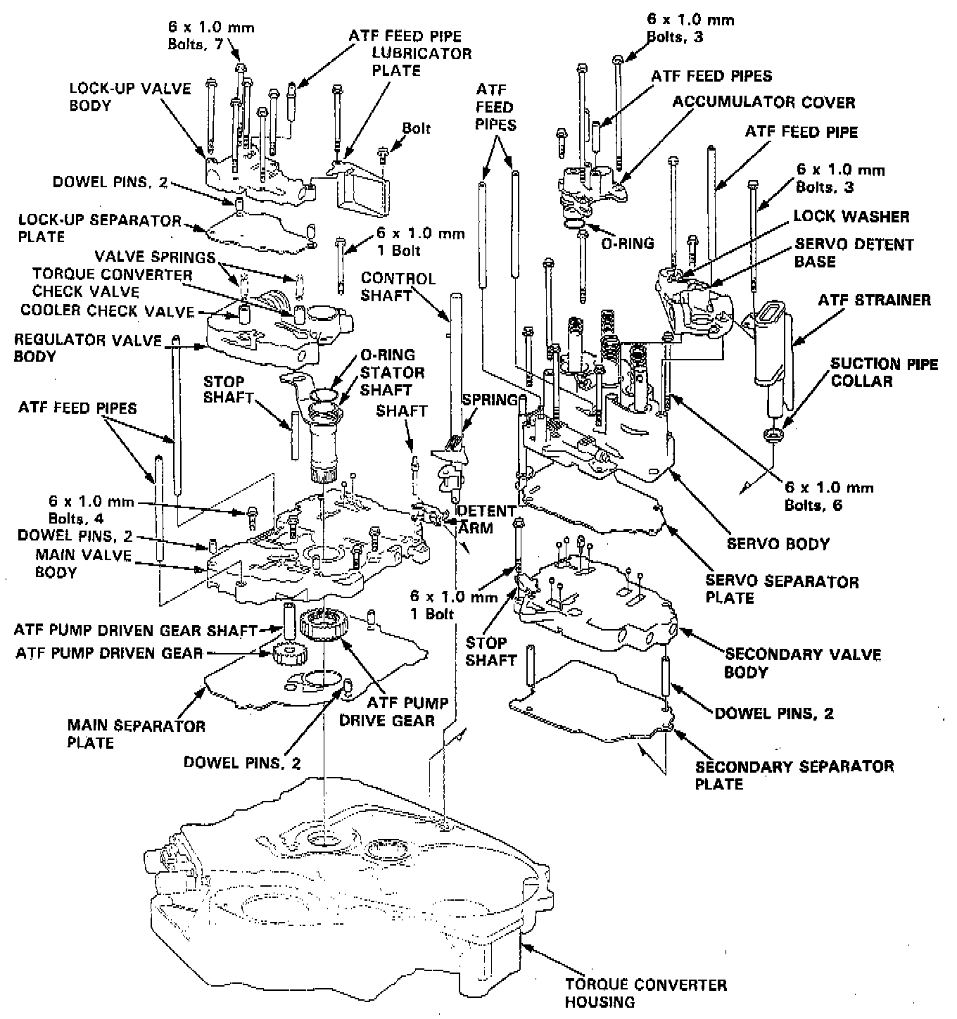 11. If the ATF pump drive gear and ATF pump driven gear shaft do not move freely, loosen the four bolts on the main valve body and disassemble the valve bodies. Realign the ATF pump driven gear shaft and reassemble the valve bodies, then retighten the bolts to the specified torque.