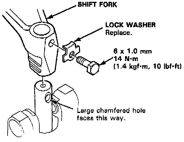 22. Turn the shift fork so the large chamfered hole is facing the fork bolt hole, then install the shift fork with the reverse selector and torque the lock bolt. Bend the lock tab against the bolt head.