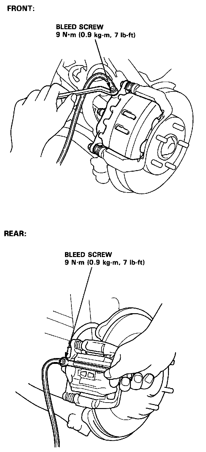NOTE: The reservoir on the master cylinder must be full at the start of bleeding procedure, and checked after bleeding each brake caliper. Add fluid as required. Use only clean DOT3 or 4 brake fluid.