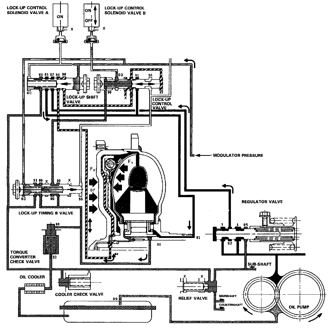 The TCM switches solenoid valve B on and off rapidly under certain conditions. The slight lock-up and half lock-up regions are maintained so as to lock the torque converter properly.