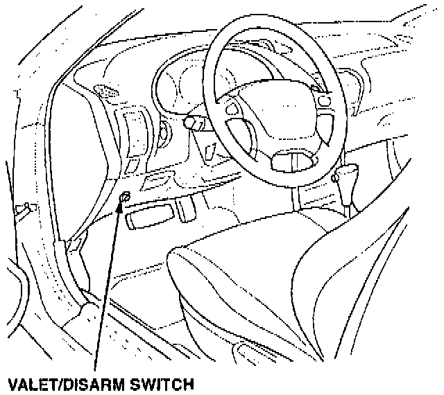 1. Turn the ignition switch on, then immediately press and hold the valet/disarm switch to enter the programing mode. Continue to hold the switch throughout the procedure. (The switch is located on the dashboard lower cover.)