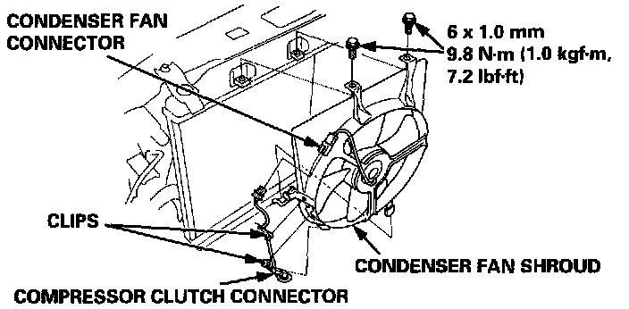 4. Disconnect the condenser fan connector. Disconnect the compressor clutch connector, then remove the compressor clutch connector and the clips from the condenser fan shroud. Remove the two mounting bolts and the condenser fan shroud.