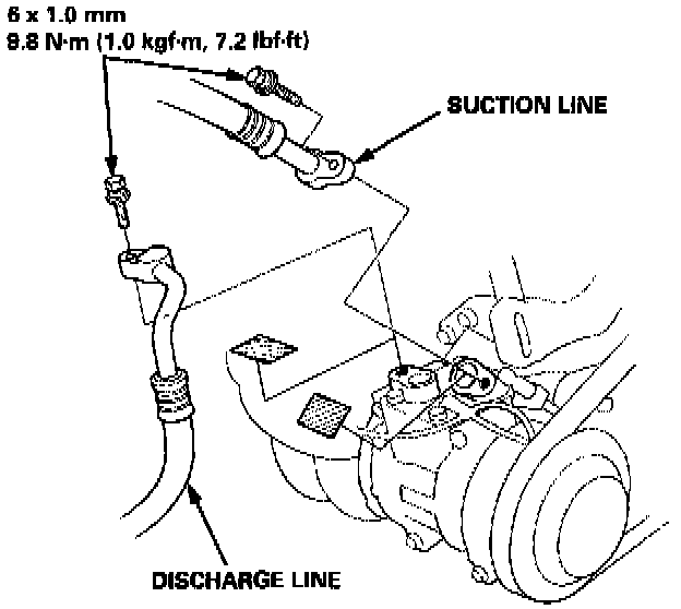 5. Remove the bolts, then disconnect the suction line and the discharge line from the compressor.