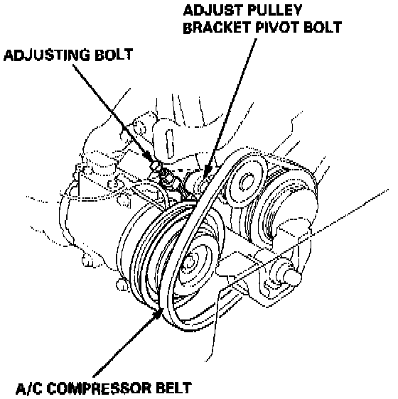 6. Loosen the adjust pulley bracket pivot bolt and the adjusting bolt, then remove the A/C compressor belt from the pulley as shown.