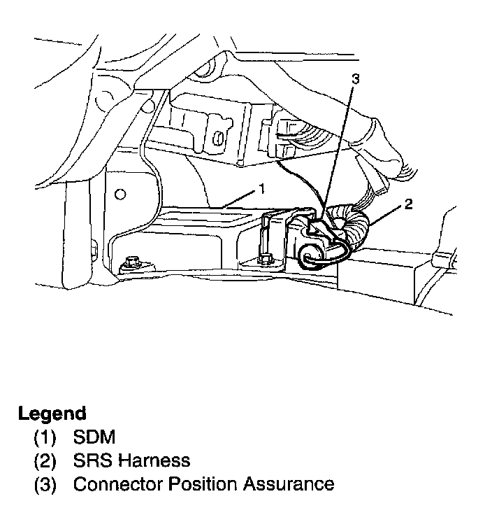 The SDM is connected to the SRS wiring harness by a 24-pin connector. This harness connector uses a shorting clip across certain terminals in the contact area. This shorting clip connects the "AIR BAG" warning lamp to ground when the SDM harness connector is disconnected or CPA (Connector Position Assurance) is not inserted even if completely connected. This will cause the "AIR BAG" warning lamp to come "ON" steady whenever the ignition switch is at the ON or START positions with the SDM disconnected.
