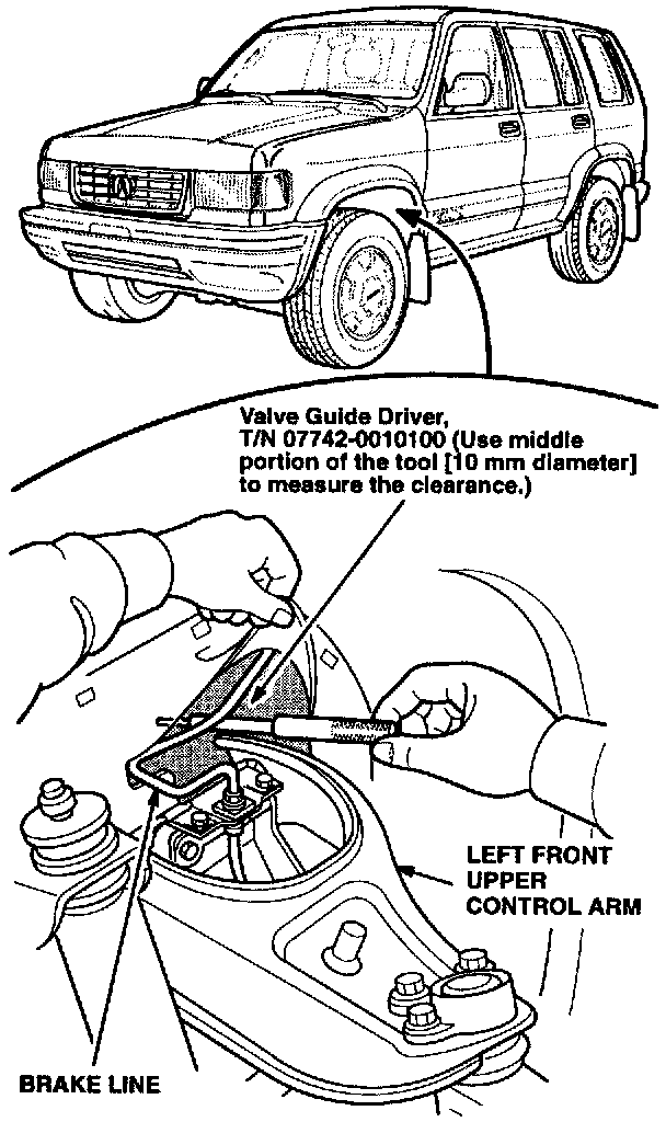 1. Using the special tool, measure the clearance between the brake line and the left front upper control arm. To get the proper measurement, the vehicle must be sitting on the ground at the proper ride height.