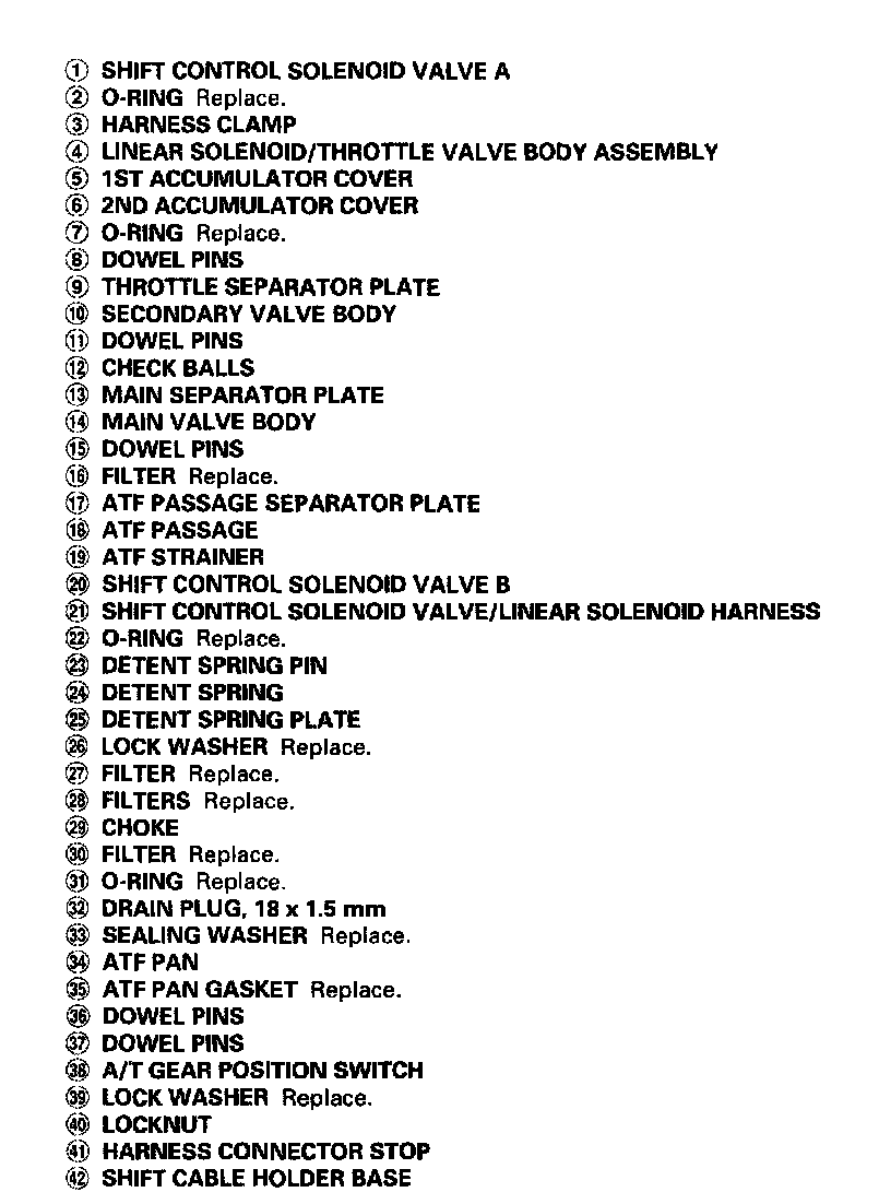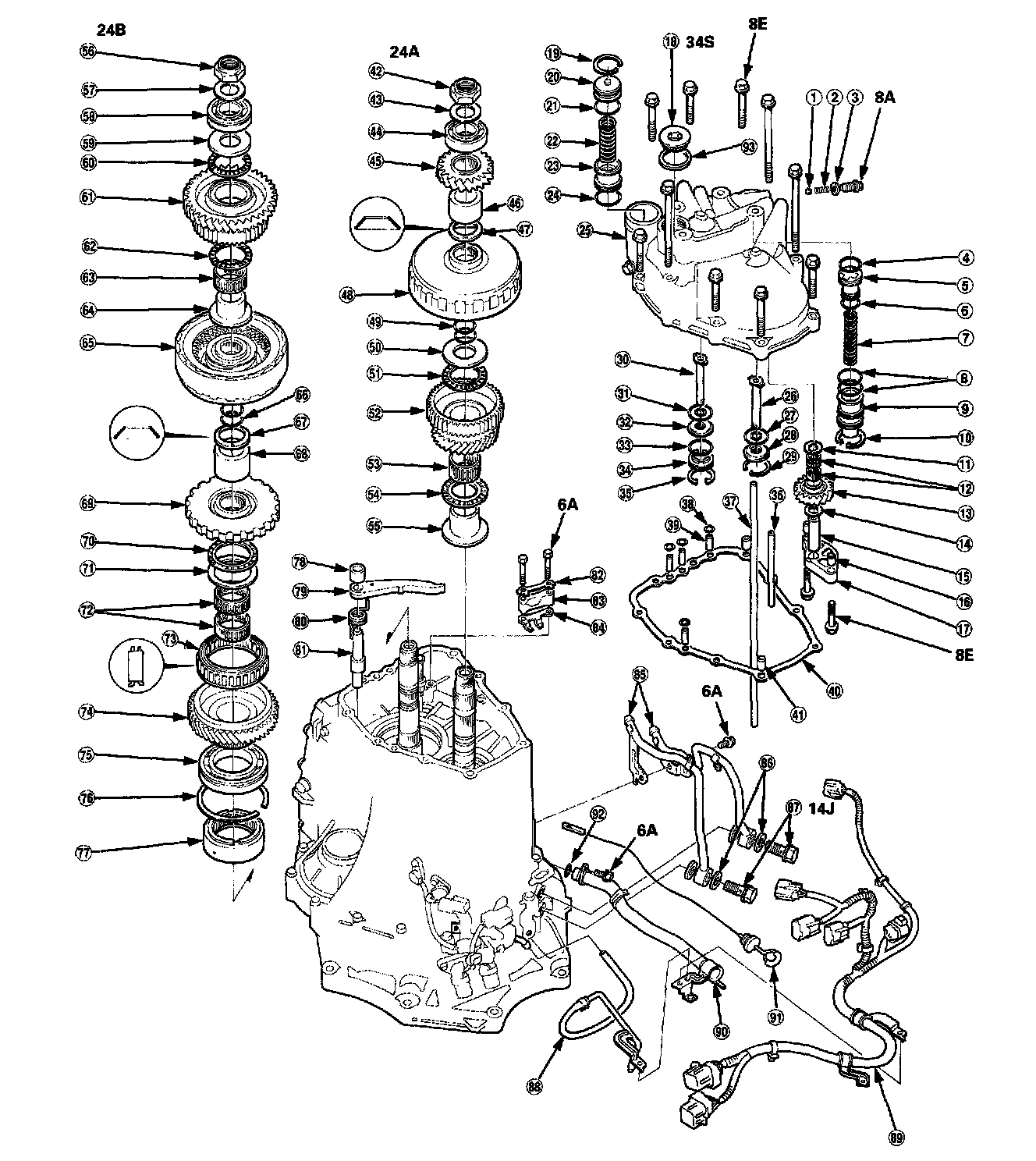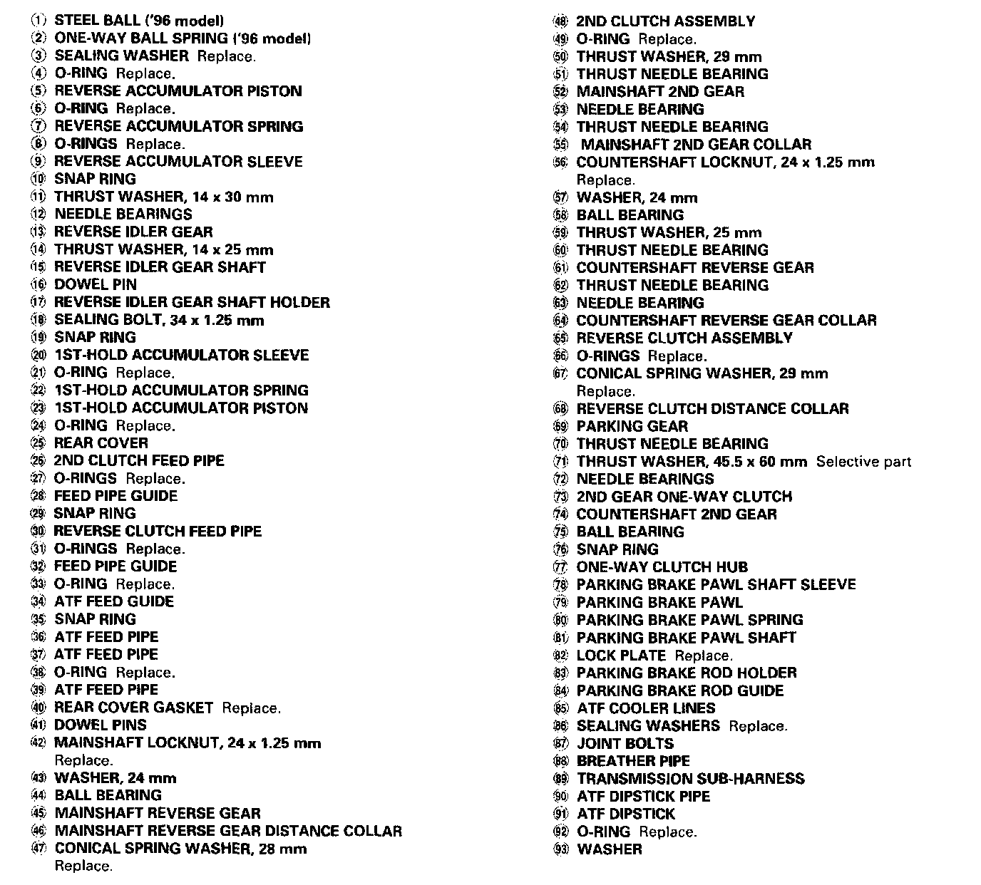 - Parts (93) is used on '96 models with the transmission No. M5HA - 1021049 and above, and on '97 -'98 models; '96 models with the transmission No. M5HA - 1000001 to M5HA - 1021048 do not use this part.