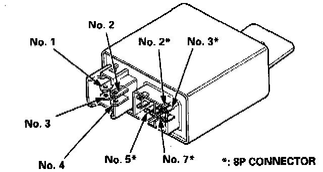 3. Attach the battery positive terminal to the No. 4 terminal and the battery negative terminal to the No. 7* terminal of the PGM-FI main relay. Then check that there is continuity between the No. 3 terminal and No. 1 terminal of the PGM-Fl main relay.