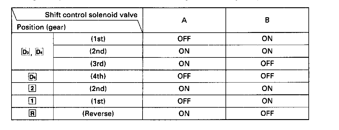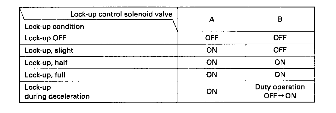 From sensor input signals, the PCM determines whether to turn the lock-up ON or OFF, and activates lock-up control solenoid valve A and/or B accordingly. The combination of driving signals to lock-up control solenoid valves A and B is shown in the table below.