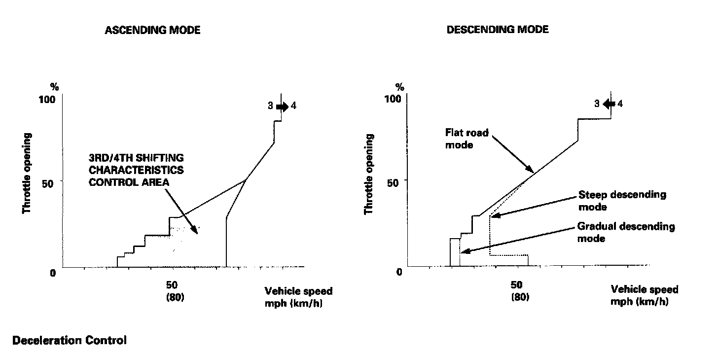 When the vehicle goes around a corner, and needs to decelerate first and then accelerate, the PCM sets the data for deceleration control to reduce the number of times the transmission shifts. When the vehicle is decelerating from speeds above 30 mph (48 km/h), the PCM shifts the transmission from 4th to 2nd earlier than normal to cope with upcoming acceleration.