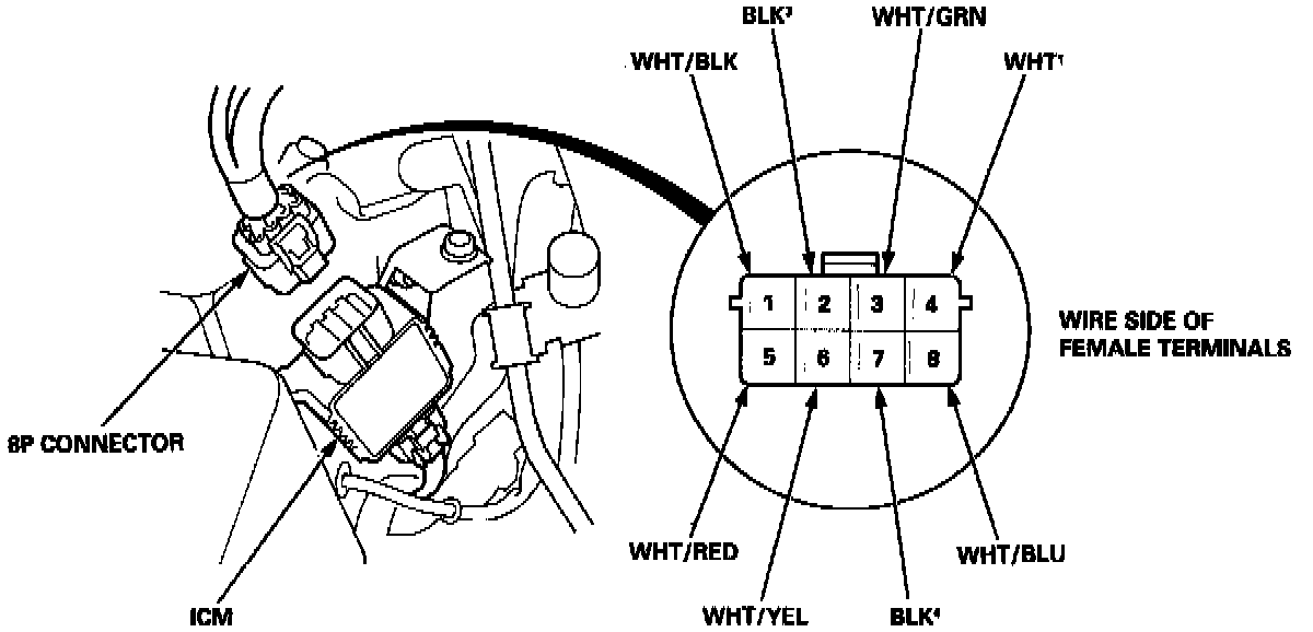 NOTE: See "Computers and Control Systems, Testing and Inspection", if the malfunction indicator lamp (MIL) blinks. Disconnect the 8P connector from the ignition control module (ICM). Inspect the connector and socket terminals to be sure they are all making good contact.