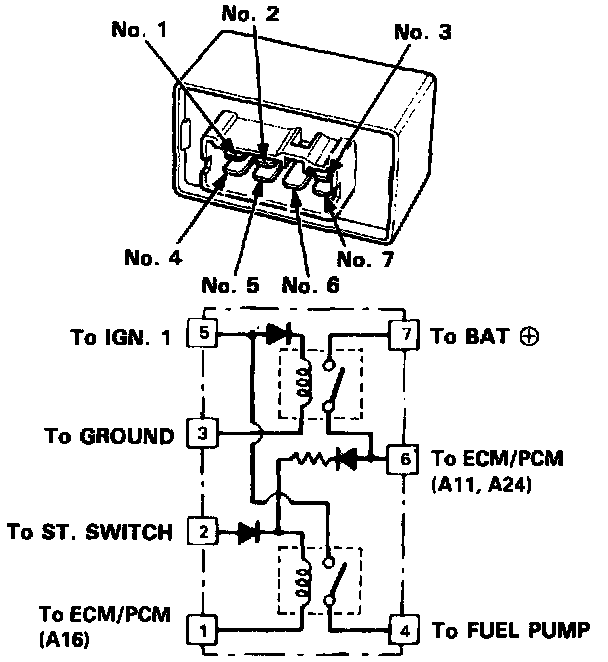 3. Attach the battery positive terminal to the No. 5 terminal and the battery negative terminal to the No.1 terminal of the PGM-FI main relay. Then check that there is continuity between the No. 7 terminal and No. 6terminal of the PGM-FI main relay.