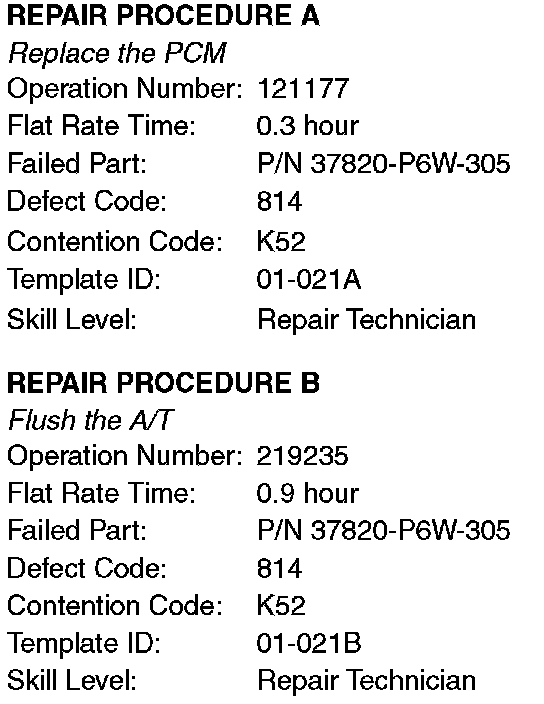 Retrieve and record the A/T freeze data with the PGM Tester. Make sure you record the freeze data values on the repair order. Refer to DIAGNOSIS to determine which of these repair actions is needed: