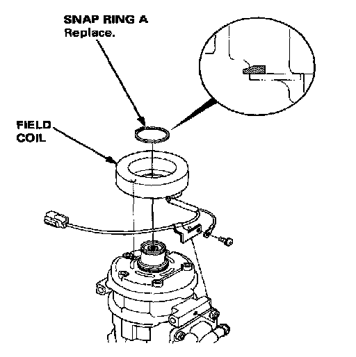 4. Remove the screw from the field Coil ground terminal. Remove the snap ring A with snap ring pliers, then remove the field Coil.