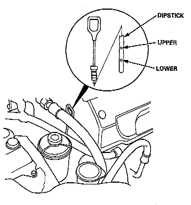 2. Make certain that the oil level indicated on the dipstick is between the upper and lower marks.