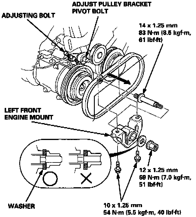 NOTE: When tightening the engine mount nut, make sure the washer is set properly on the left front engine mount as shown.
