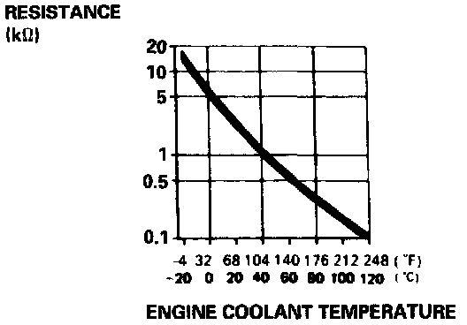 The ECT Sensor is a temperature dependant resistor (thermistor). The resistance of the thermistor decreases as the engine coolant temperature increases as shown.