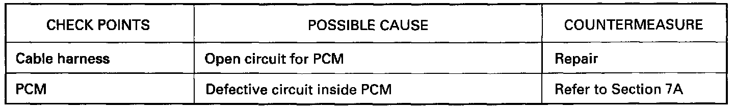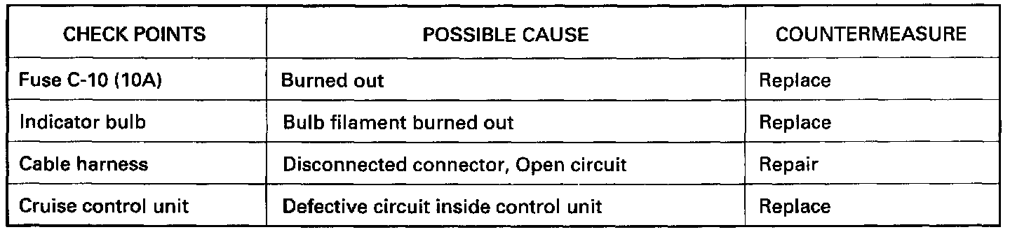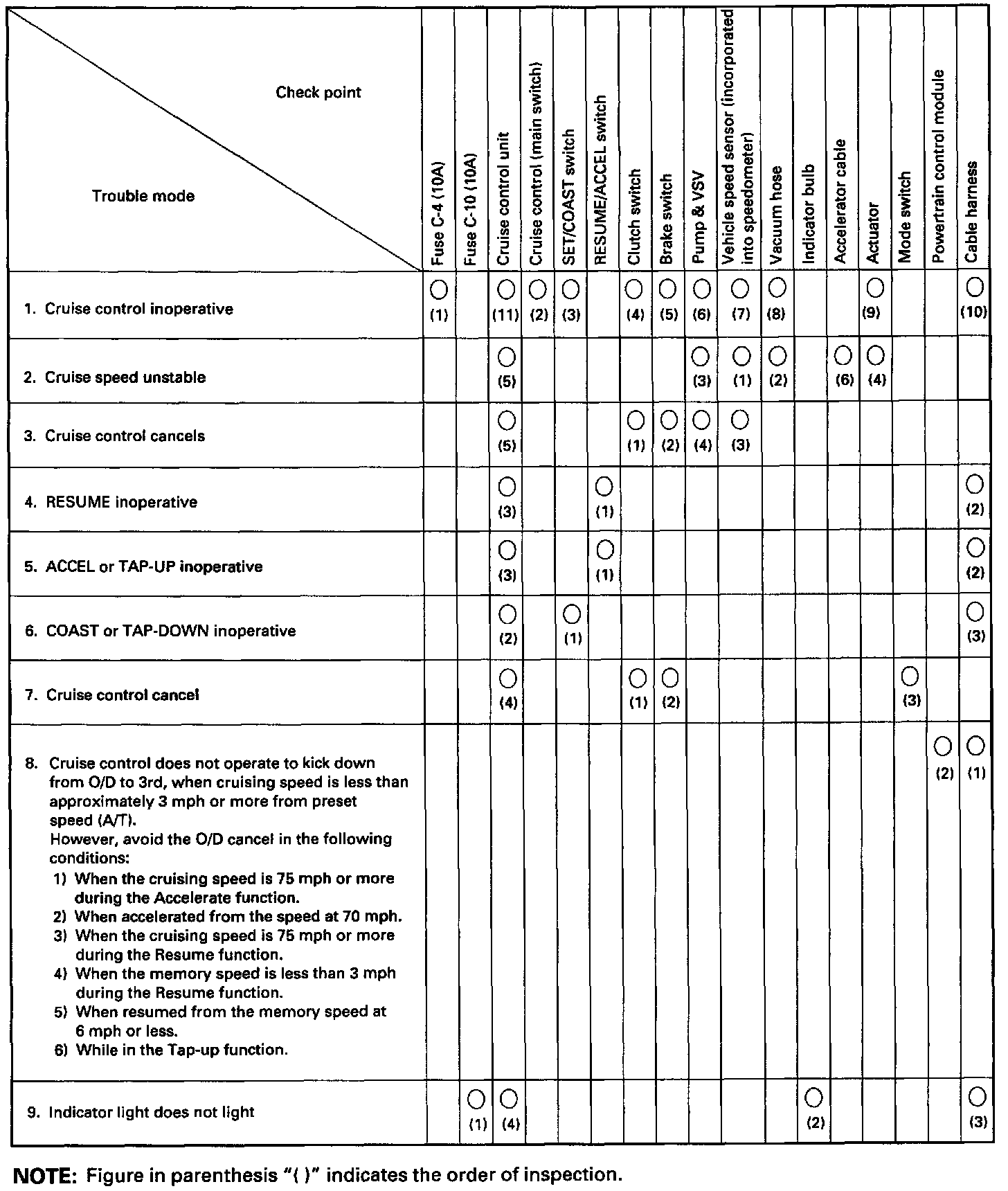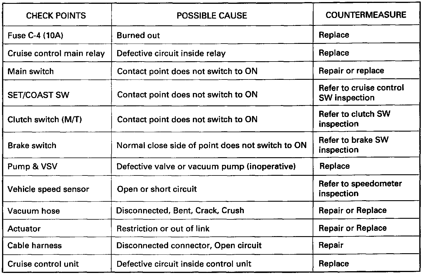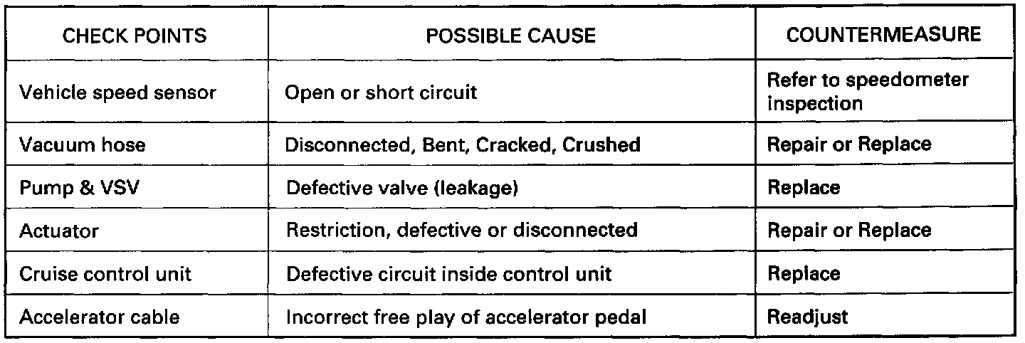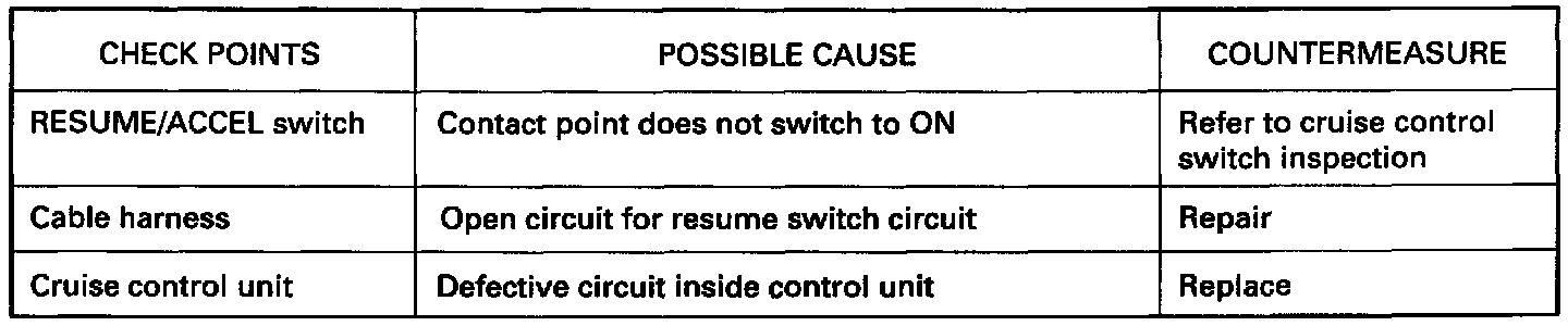 8. Cruise control does not operate to kick down O/D to 3rd, when cruising speed is less than approximately 3 mph or more from preset speed (A/T)