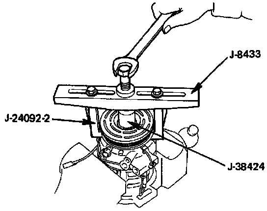 ^ Using pulley puller pilot (J-38424), pulley puller (J-8433) and pulley puller leg (J-24092) to remove the pulley assembly.