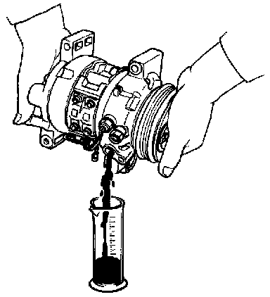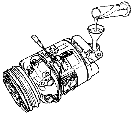 150cc (5.0 fl.oz.) of oil is charged in compressor (service parts). So it is necessary to drain the proper amount of oil from the new compressor.