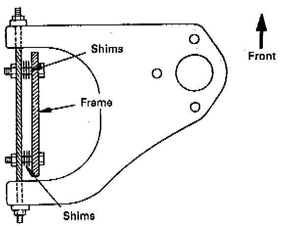 CAUTION: Left and right side to be equal within 1/3.The caster angle can be adjusted by means of the caster shims installed between the chassis frame and fulcrum pins. Tighten the fulcrum pin bolt to the specified torque 152 Nm (112 ft. lbs.).