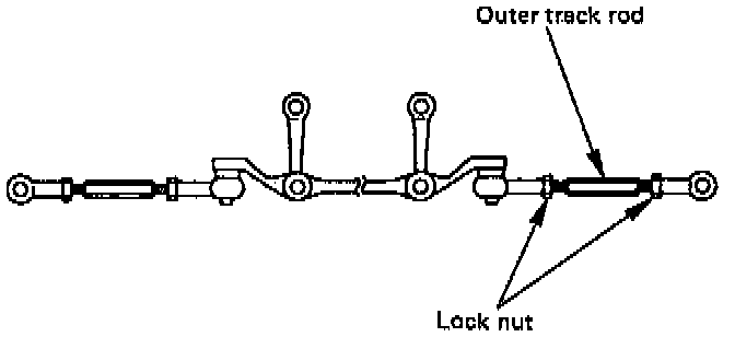 To adjust the toe-in angle, loosen the lock nuts on the outer track rods and turn the outer track rods. Turn both rods the same amount, to keep the steering wheel centered. Tighten the lock nut to the specified torque