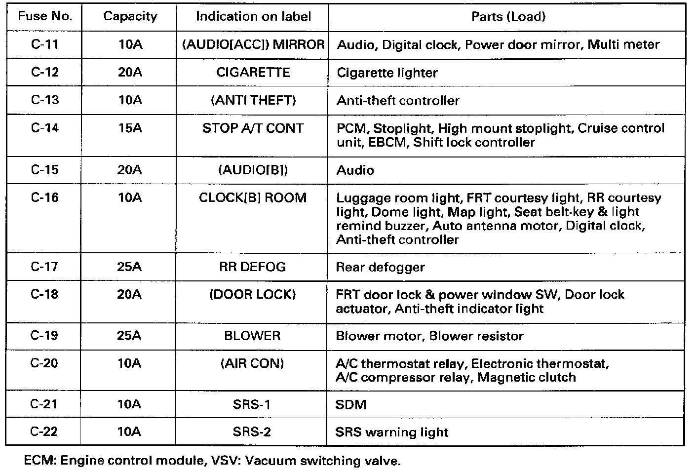 Reference Table of Fuse (Fuse Box)