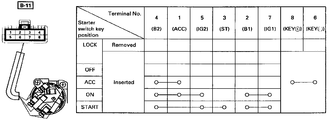 The starter switch positions are LOCK, OFF, ACC, ON and START. Turning the starter key to these positions provides a circuit for starting the engine, the operation of accessories, or stops the engine.
