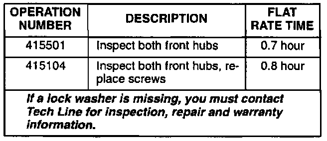 Inspect both front hubs to verify that the lock washer and retaining screws are installed. Replace any missing parts.