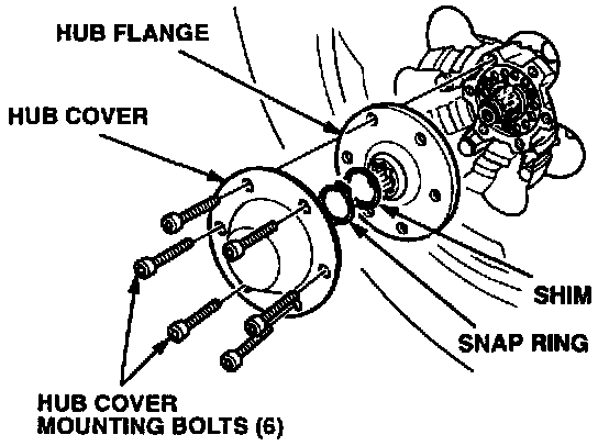 4. The hub cover is bonded to the hub flange with adhesive. Loosen the bond by prying on the edge of the hub cover. Remove the hub cover.