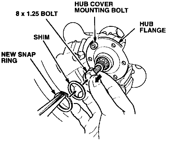 9. Slide the shim and a new snap ring (see PARTS INFORMATION) onto the axle. Thread a 8 x 1.25 bolt into the end of the axle. Pull on the bolt to make sure the axle is extended, then install the snap ring. Make sure the snap ring is fully seated in its groove. Remove the hub cover mounting bolt and the 8 x 1.25 bolt.