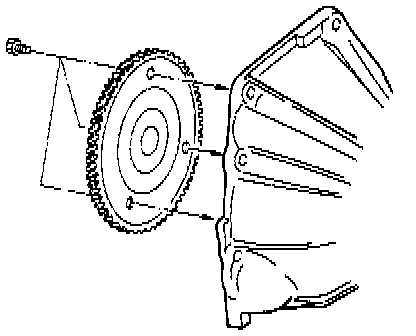 - Install flywheel-torque converter bolts (3 pieces) by turning crankshaft.