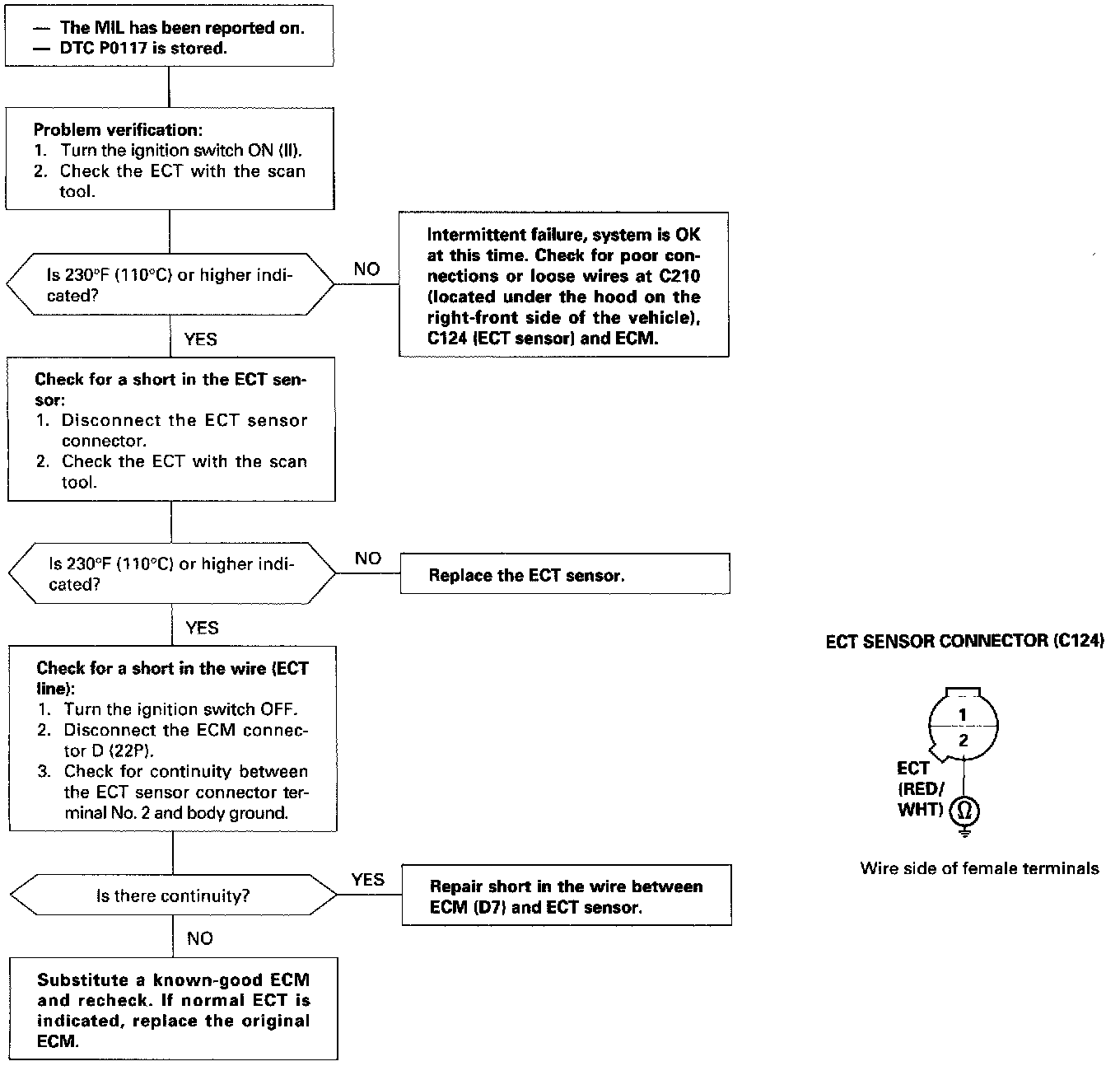 The scan tool indicates Diagnostic Trouble Code (DTC) PO117: A low voltage (high temperature) problem in the Engine Coolant Temperature (ECT) sensor circuit.