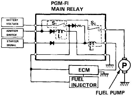 The PGM-FI main relay actually contains two individual relays. This relay is located at the left side of the cowl. One relay is energized whenever the ignition is on which supplies the battery voltage to the ECM (Engine Control Module), power to the fuel injectors, and power for the second relay. The second relay is energized for two seconds when the ignition is switched on, and when the engine is running, to supply power to the fuel pump.