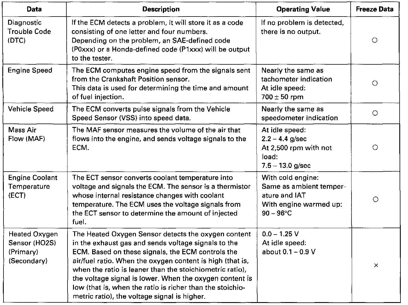 By connecting the OBD II scan tool or the Honda PGM Tester to the 16P data link connector (DLC), various data can be retrieved from the ECM. The items listed in the table above conform to the SAE recommended practice.