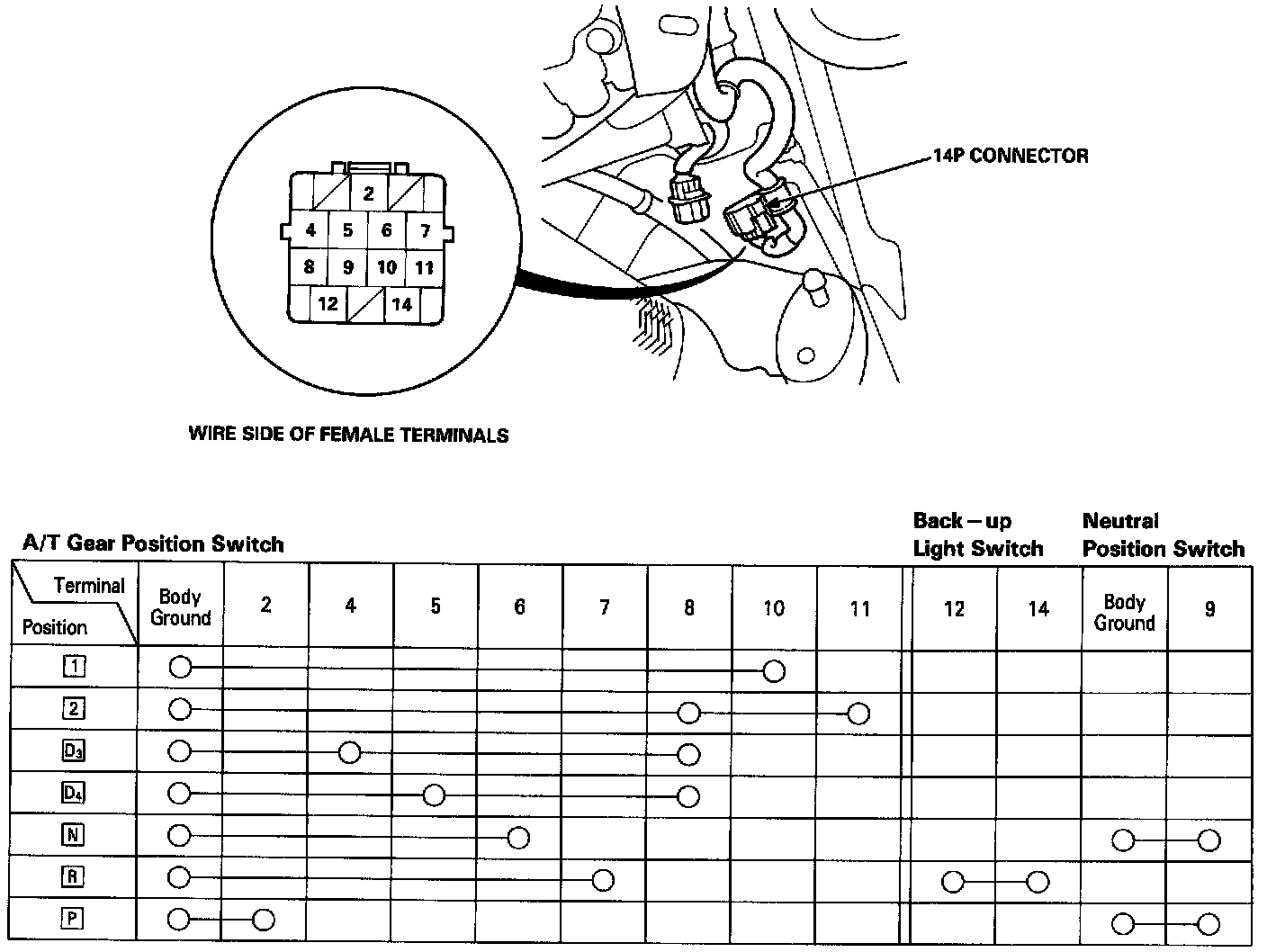 1. Raise the car, and remove the transmission splash shield.2. Disconnect the 14P connector from the A/T gear position switch.