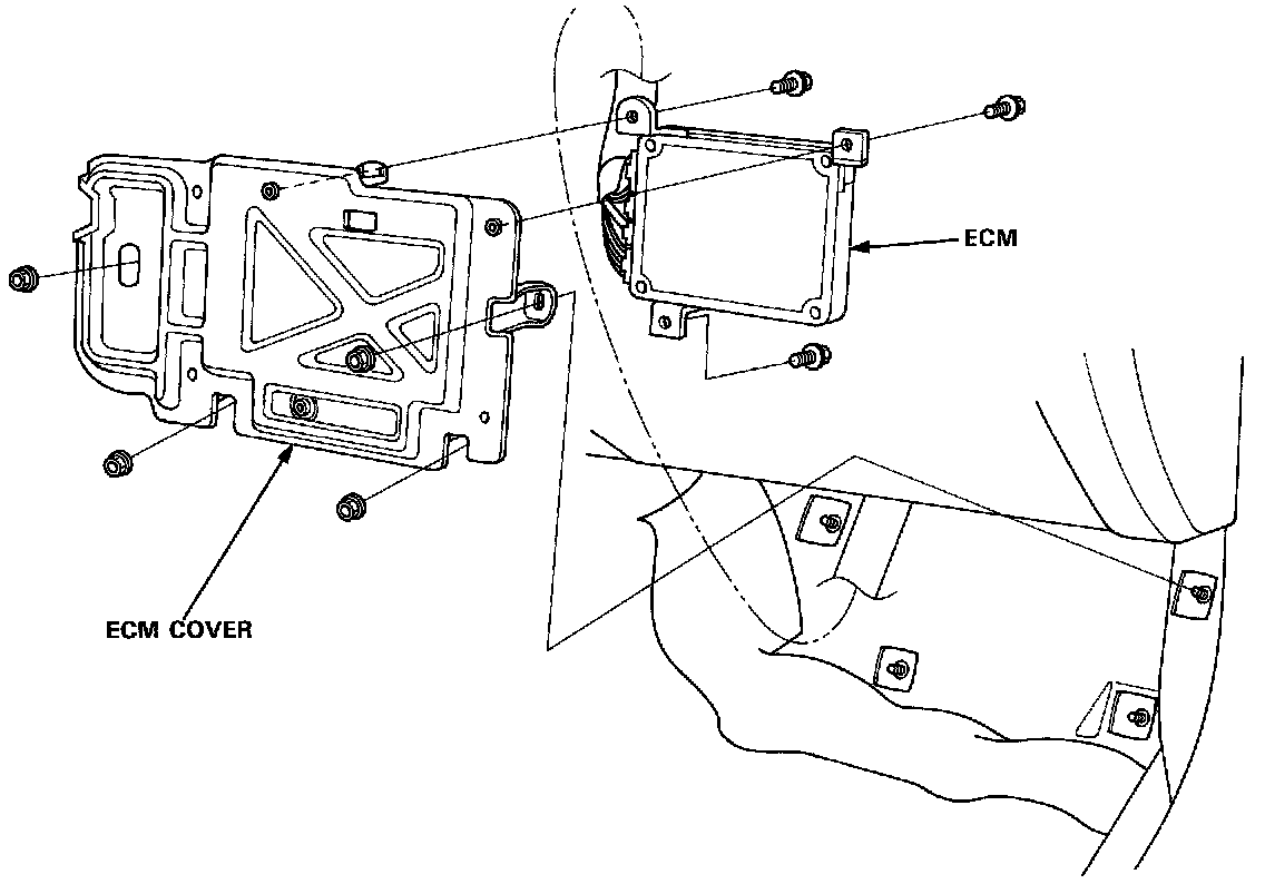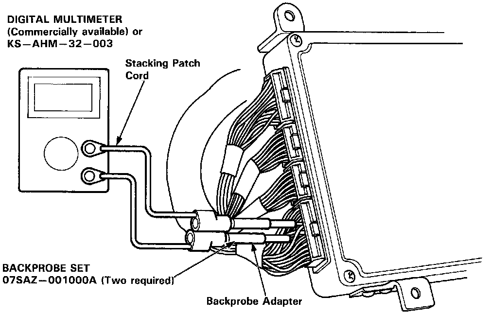 If the inspection for a particular code requires voltage or resistance checks at the ECM connectors, remove the right door sill molding. Pull the carpet back to expose the ECM. Unbolt the ECM cover, and connect the backprobe sets and a digital multimeter as described below. Check the system according to the procedure described for the appropriate code(s).