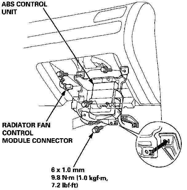 2. Remove the ABS control unit mounting bolts, and turn the ABS control unit over Disconnect the radiator fan timer control unit connector.