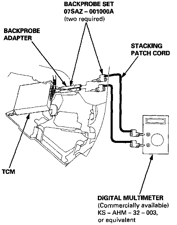 4. Inspect the circuit on the TCM according to the troubleshooting flowchart with the special tools and a digital multimeter as shown.